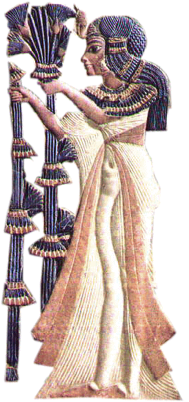 Ankhesenamon etais d’une grande beauté. Coiffée d’une perruque délicate et compliquée, le serpent uræus au front, les yeux fardés, le visage soigneusement maquiller elle porte des boucles d'oreille, un large collier à plusieurs rangs et une longue robe blanche tombant jusqu’aux sandales. La grande épouse royale etait la séduction même.